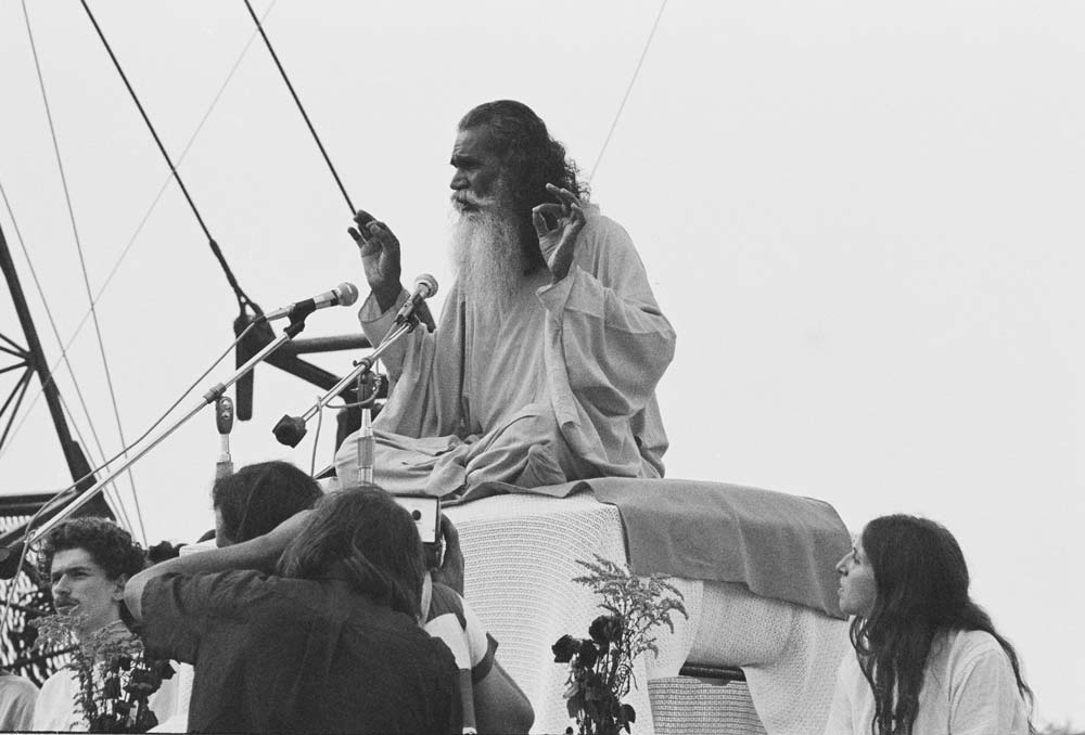 Dans l’effervescence contre-culturelle des années 1960 et 1970, les gourous indiens ne manquaient pas dans le monde de la musique. Les Beatles et les Beach Boys ont brièvement été inspirés par Maharishi Mahesh Yogi, et George Harrison par Sri Prabhupada. John McLaughlin et Carlos Santana ont été inspirés par Sri Chinmoy. Pete Townshend par Meher Baba. Satchidananda, arrivé aux États-Unis en 1966, a eu l’honneur historique de prononcer la bénédiction d’ouverture à Woodstock. « La musique est un son céleste, et c’est le son qui contrôle l’univers tout entier, et non les vibrations atomiques. L’énergie sonore, la puissance du son, est infiniment supérieure à toute autre puissance en ce monde », a-t-il déclaré avant d’entraîner la foule de Bethel dans un chant. D’une présence charismatique et d’une présence impressionnante, il comptait parmi ses disciples célèbres Carole King, l’artiste Peter Max, l’acteur Raul Julia et bien d’autres. « Il était sans conteste le plus bel être humain qui ait jamais foulé cette terre », se souvient Tulsi Reynolds, qui jouait du tamboura dans son groupe ce soir-là à Carnegie et qui figurait également sur le titre « Journey in Satchidananda ». et « Conscience universelle ». « Il était d’une beauté à couper le souffle et il ressemblait à – si vous deviez imaginer à quoi Dieu ressemble – il ressemblait à Swami Satchidananda. »