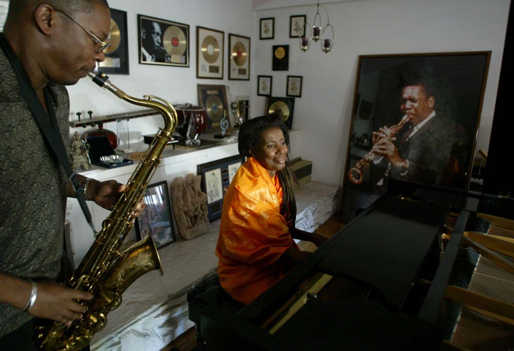 Alice Coltrane joue du piano Steinway offert par son mari en 1964, tandis que son fils Ravi joue du saxophone devant une photographie de John Coltrane. Photo : J. Emilio Flores/Corbis via Getty.