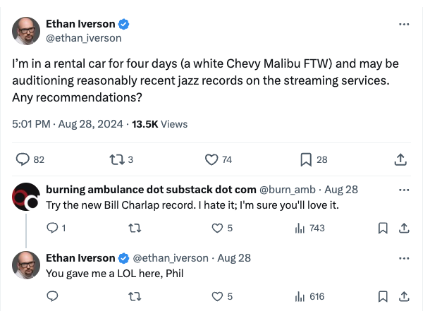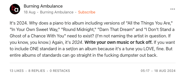 Freeman est particulièrement agacé lorsqu’un nouvel album de jazz fait la part belle aux standards connus, et — n’ayant jamais hésité à susciter un peu de polémique sur Internet — il avait déjà publié un tweet rageur et indirect à propos de l’album de Charlap sur tous les réseaux sociaux.